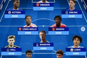 中场:沃顿(水晶宫,4500万欧)、刘易斯-斯凯利(阿森纳,4500万欧)、梅努(曼联,5000万欧)