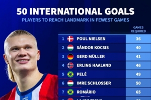 体育资讯10月13日讯 在上周对阵以色列的世预赛中,哈兰德上演帽子戏法,这让他成为历史上第4快打入国家队第50球的球员。作为对比,梅西用了107场才达到这一里程碑,而C罗则用了114场。德转列出了达成国家队50球所用场次最少的球员。
