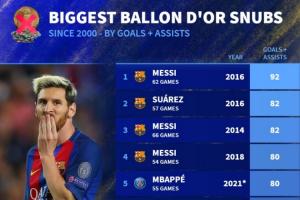体育资讯09月24日讯 德国转会市场盘点了各年份金球奖数据,排出了对应年份中无缘金球奖的最高进球+助攻数据。以下是详细排名。