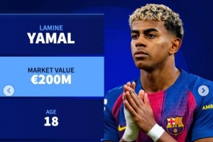 德转列16-25岁各年龄最高身价:亚马尔2亿,贝林、哈兰德均1.8亿