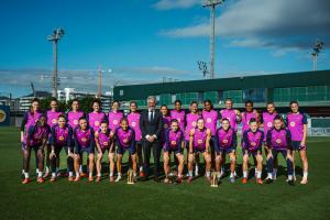 在体育城训练场上,巴萨女足球员们与俱乐部官员哈维尔-普伊一起合影,身旁摆放着三项重要奖杯:邦马蒂连续第三次获得金球奖、维姬-洛佩兹赢得首届科帕奖以及埃瓦-帕乔尔荣获首个盖德-穆勒奖。