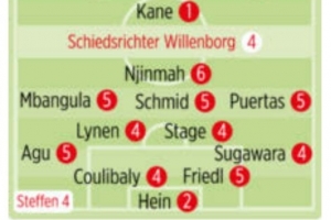 体育资讯9月27日讯 德甲第5轮比赛,拜仁主场4-0击败不莱梅,德国媒体《图片报》为两队球员评分,若纳坦-塔、凯恩、迪亚斯1分最高。