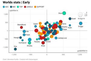 体育资讯10月21日讯 外媒发布截至目前世界赛前14分钟经济差与经验差数据图(其中横坐标代表经济差,纵坐标代表经验差,图中圆圈大小代表14分钟的击杀与助攻数的平均值,以4、1.5、0.4为节点):Zeus经验差最高;Doggo经济差最高。