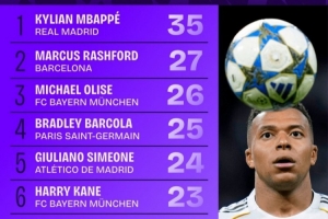 体育资讯10月23日讯 本赛季欧冠联赛阶段已战罢3轮,Squawka统计了到目前为止对方禁区内触球次数榜单,姆巴佩35次第一,拉什福德27次第二。