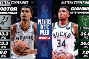 体育资讯10月28日讯 NBA官方宣布,字母哥和文班亚马分别当选了东西部第一周的周最佳球员。