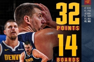32+14+14!掘金发布约基奇数据海报:这些都是32分钟里做到的