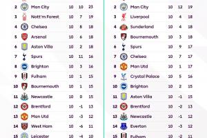 来找亮点了英超官方晒上赛季、本赛季10轮过后积分榜对比